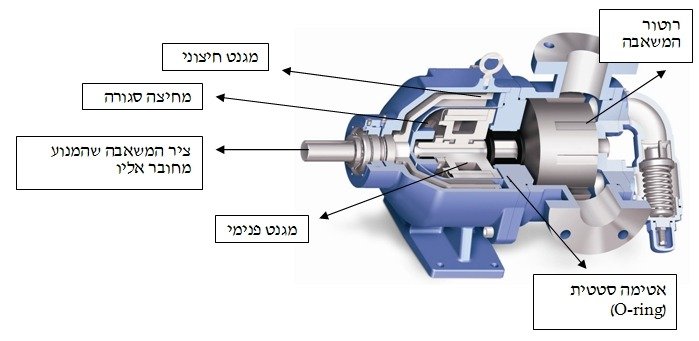 בין המגנט החיצוני לפנימי, יש מחיצה סגורה (יכולה להיות מתכתית או סוג פלסטיק) שחוצץ בין חללי המגנטים ובכך, "כולא" את הנוזל המועבר במשאבה ללא יכולת לצאת דרך הציר, היות והציר מסתיים בתוך חלל המגנט הפנימי).