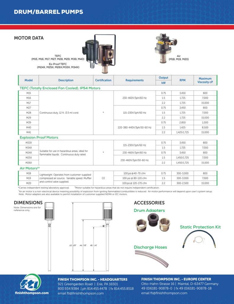 * When pumping flammables or combustibles, use explosion proof electric or air drive motors on stainless steel tubes with static protection kit.